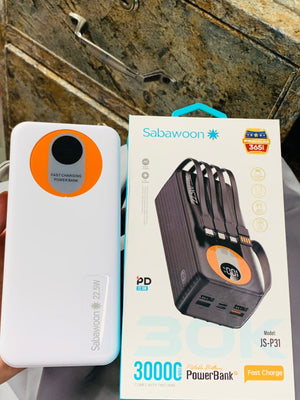 Keep your devices powered anywhere with the Sabawoon 30000mAh Power Bank. Designed with a high-capacity lithium battery and four built-in cables, this power bank ensures fast, reliable charging for all types of mobile devices. Perfect for travel, office, or daily use, it delivers long-lasting performance with convenience and durability.